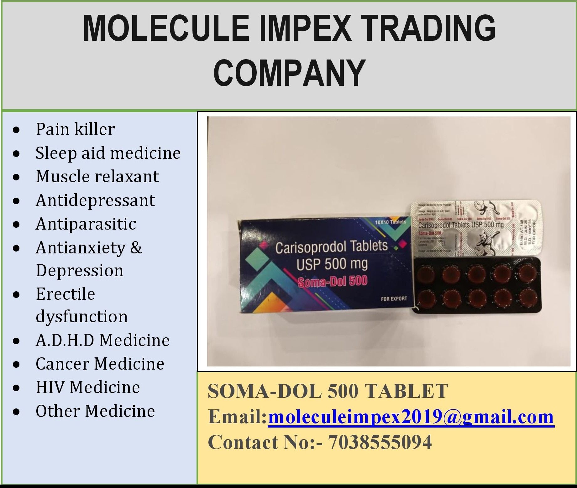 Soma Dol 500 Tablets Supplier, Dealer, Exporter We Molecule impex Is the Leading Supplier, Dealer, Exporter for Soma Dol 500 Tablets in London England, Washington USA, Canberra Australia, wellington New Zealand. We Have All Types of Soma Dol 500 Tablets Available and We Are Supplier, Dealer and Exporter in London England, Washington USA, Canberra Australia, wellington New Zealand