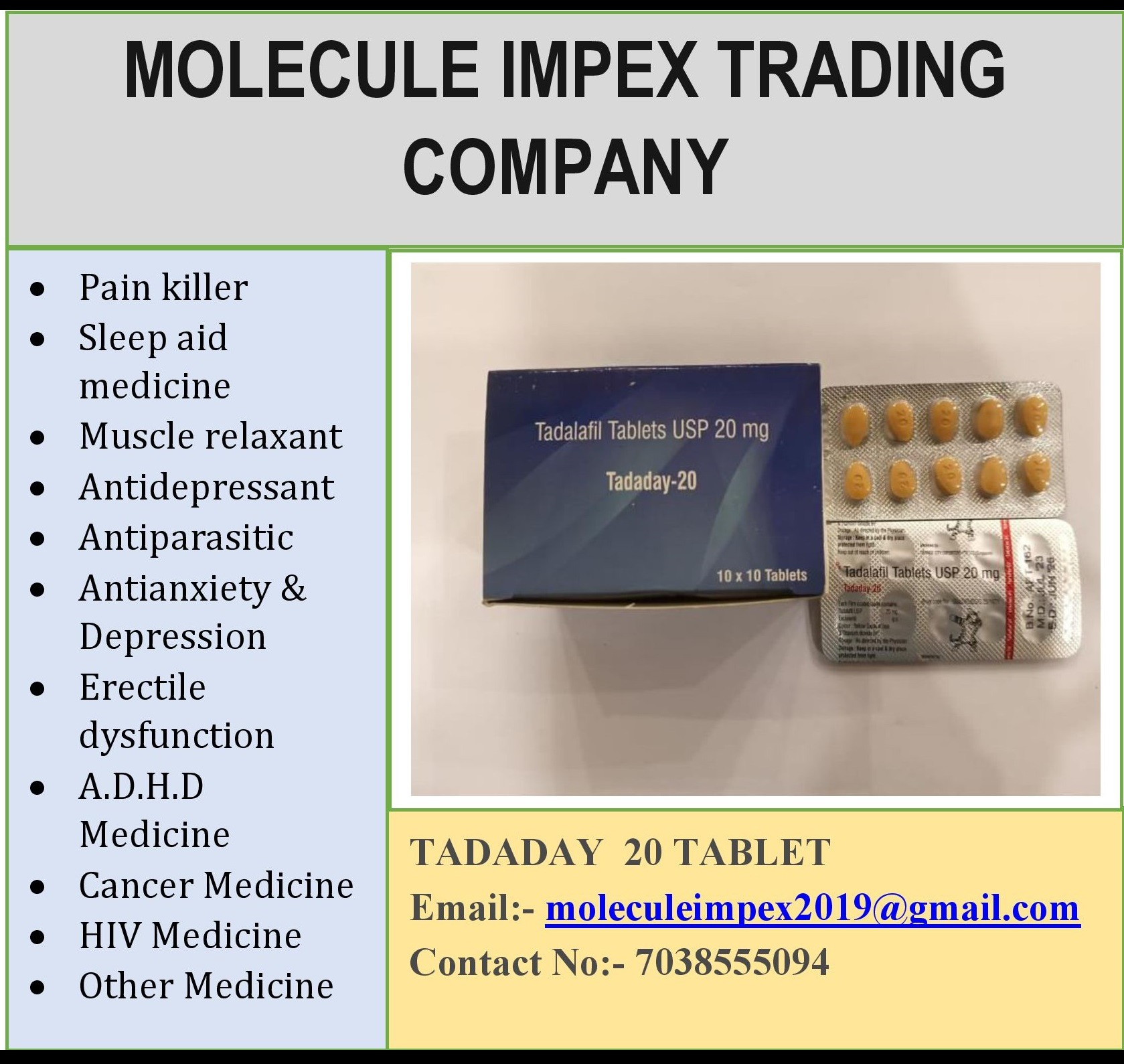 We Molecule impex Is the Leading Supplier, Dealer, Exporter for Tadaday 20 Tablets in London England, Washington USA, Canberra Australia, wellington New Zealand.