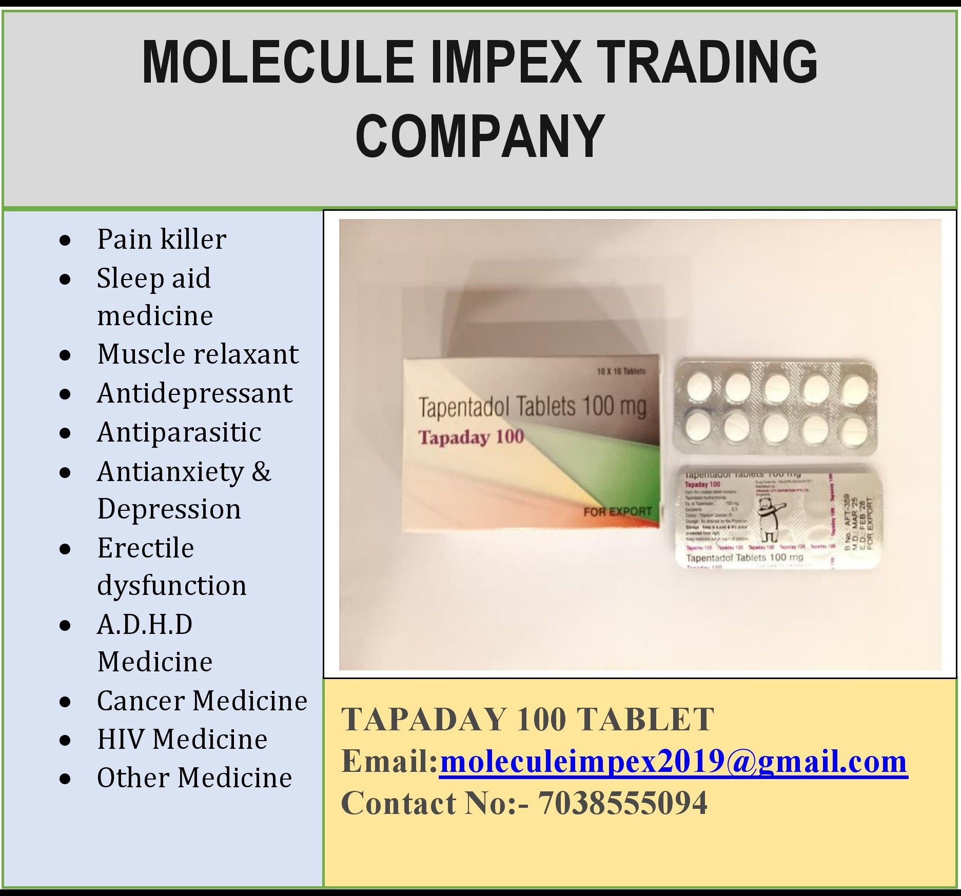 Tapaday 100 Tablets Supplier, Dealer, Exporter We Molecule impex Is the Leading Supplier, Dealer, Exporter for Tapaday 100 Tablets in London England, Washington USA, Canberra Australia, wellington New Zealand. We Have All Types of Tapaday 100 Tablets Available and We Are Supplier, Dealer and Exporter in London England, Washington USA, Canberra Australia, wellington New Zealand